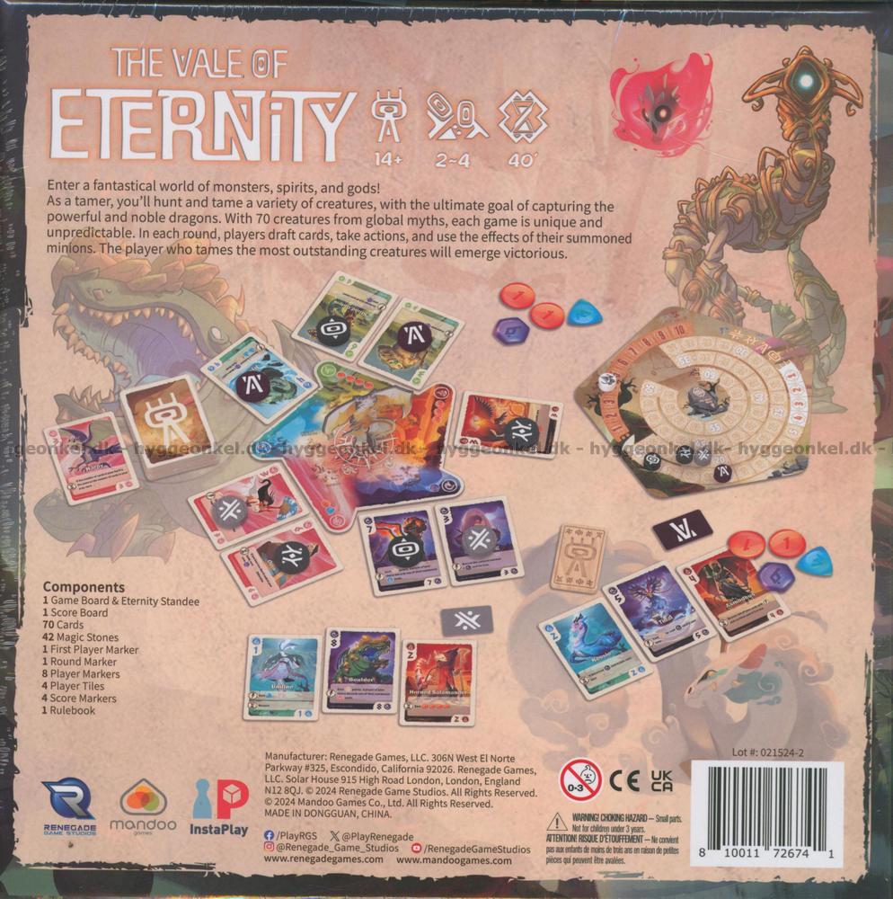 Spelet fortsätter tills en vinnare utses, baserat på vem som har fått kontroll över de mest imponerande varelserna. Med sina många unika kort erbjuder Vale of Eternity en djup, strategisk upplevelse.