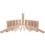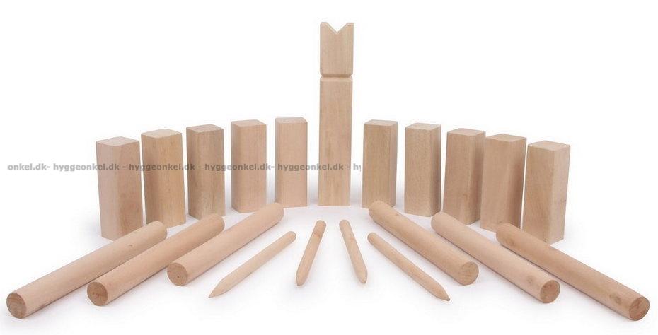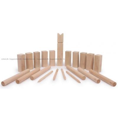 1 kung (5 x 5 x 25 cm) - 10 kubbar (4,5 x 4,5 x 12 cm) - 6 runda kastpinnar (2,5 x 25 cm) - 4 pinnar för att markera banan (1 x 20 cm).