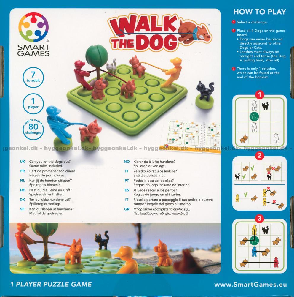 Du väljer en utmaning och placerar den på spelbrädet. Därefter är det din uppgift att placera de 4 hundarna korrekt på brädet.