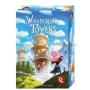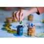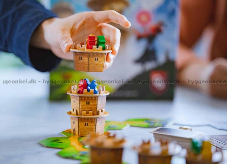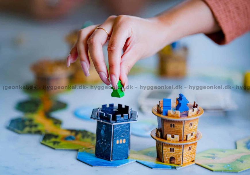 Kort, brickor, marker, pjäser i trä och torn i 3D.