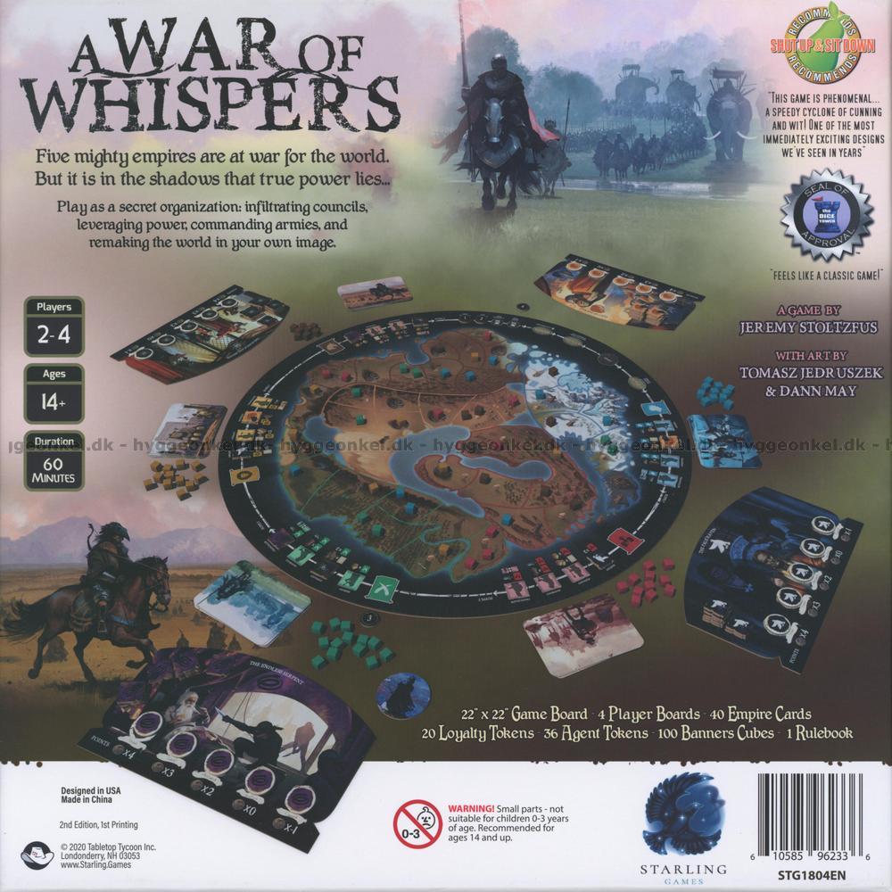 War of Whispers bjuder på strategiska överväganden, dolda agendor och lojaliteter som skiftar. Bear, Lion, Elephant, Horse och Eagle - dessa är namnen på fem mäktiga imperier i detta spel som handlar om krig om världsherradömet.