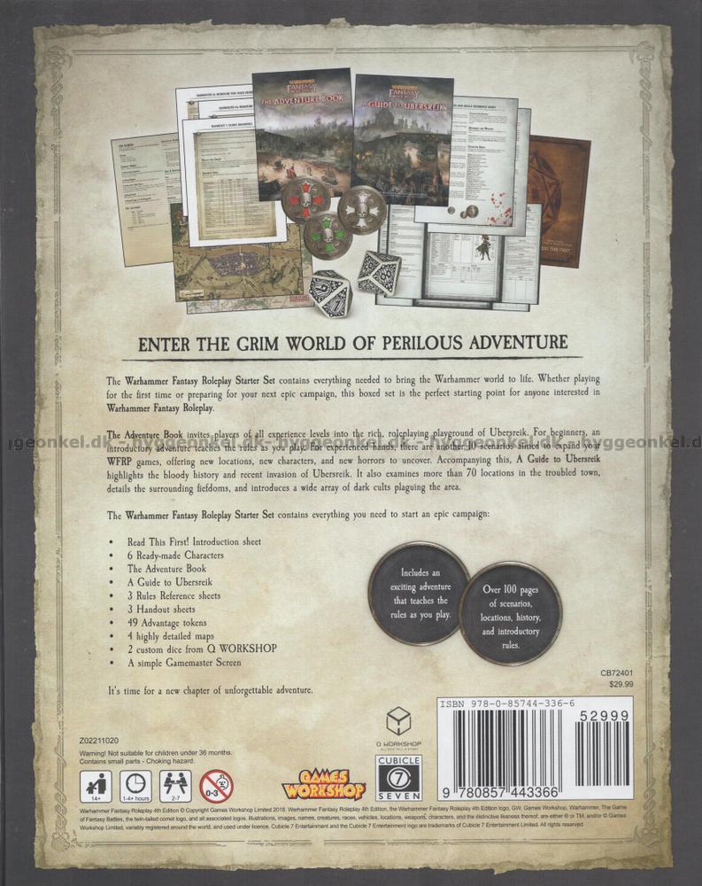 Med mer än 100 sidor av äventyr, regler och information om kampanjvärlden samt kort, handouts, speciella rollspelstärningar från Q WORKSHOP, pre-genererade karaktärer, en praktisk GM Screen och mycket mer, är denna box en utmärkt introduktion till WHFR-universumet.