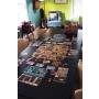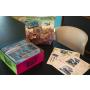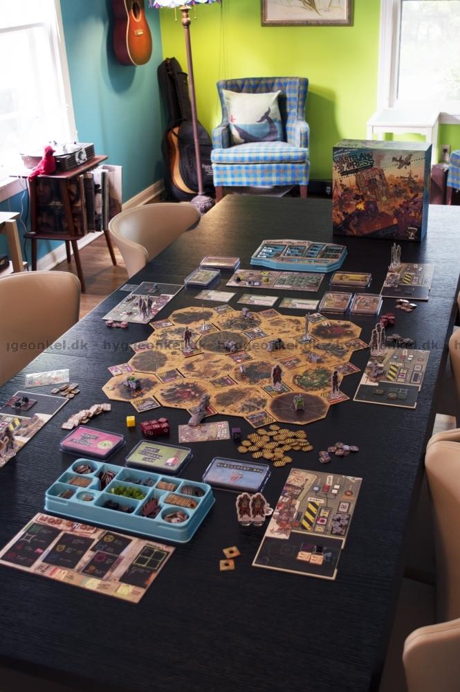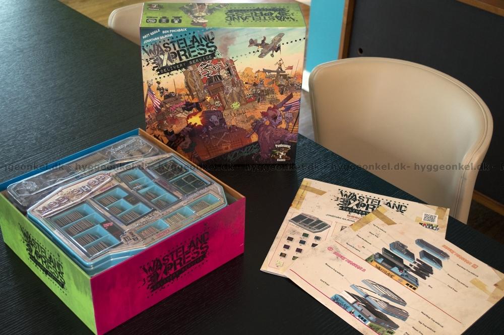 Kartbrickor, kort, tärningar, kort, marker och miniatyrfigurer i plast.