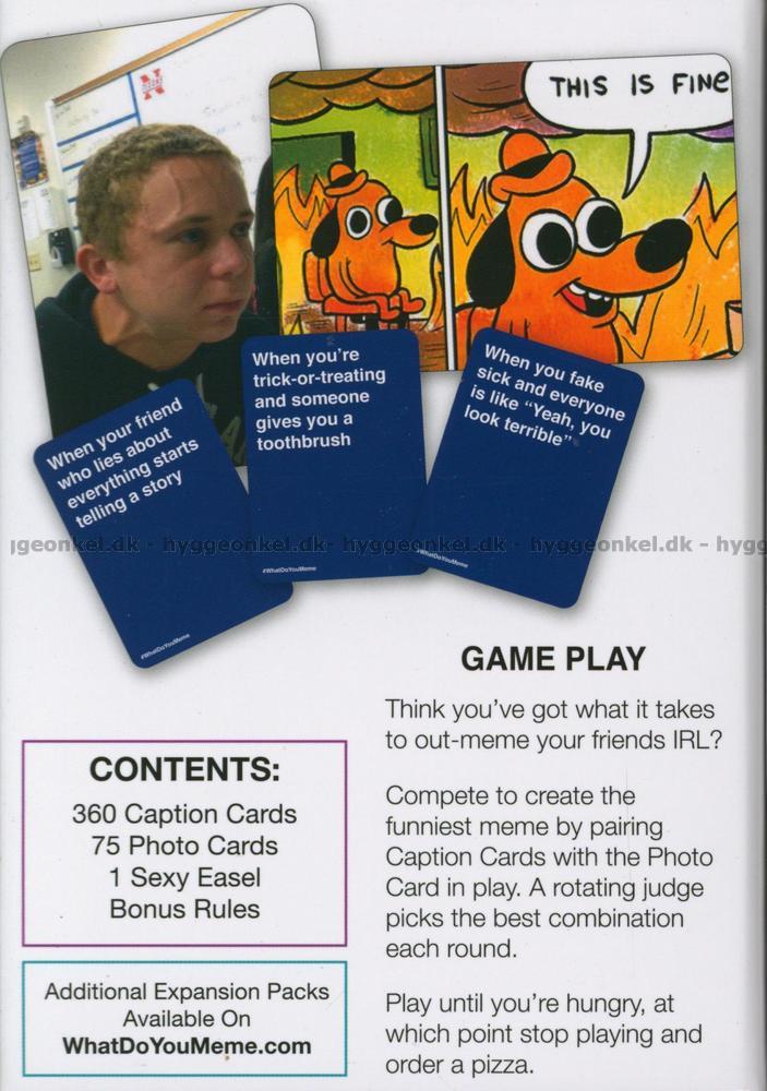 What Do You Meme? är ett humoristiskt spel som ger många roliga stunder med dem som du spelar med. Grundspelet innehåller totalt 435 kort, och om du skulle slita ut dem så kan du köpa ett eller flera av de många olika expansionspaket som finns i serien.