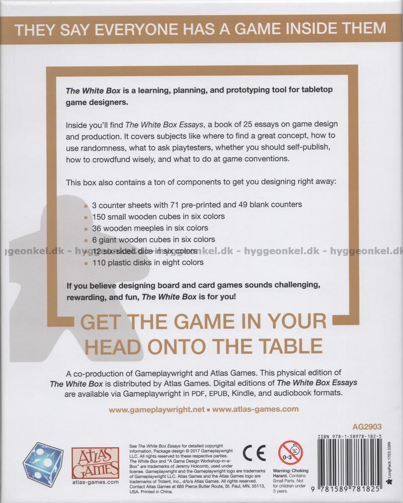 White Box innehåller för det första en bok om speldesign med 25 lärorika texter om koncept, slump, hur man testar spel med mera.