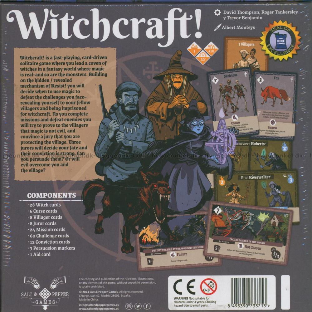 Witchcraft! är ett stämningsfullt och snabbt kortspel för en spelare, där du leder ett brödraskap av häxor i en värld där magi och monster är verkliga. Du måste använda dina förmågor med eftertanke, för varje gång du avslöjar din magi riskerar du att bli upptäckt och fängslad som häxa. Genom att genomföra uppdrag och besegra fiender försöker du bevisa att magin kan användas för att skydda byn – och övertyga tre jurymedlemmar om att du inte är ond, utan en beskyddare. Varje häxfamilj har sina styrkor: vissa avslöjar hot, andra ökar din styrka eller hjälper dig att avslöja jurymedlemmarnas övertygelse. Med åtta olika jurymedlemmar, som var och en står inför en unik fiende – från den huvudlöse ryttaren till Baba Yaga och den fruktade fågelskrämman – erbjuder Witchcraft! över 50 olika kombinationer av utmaningar, uppdrag och monster. Men var försiktig: förlorar du två uppdrag eller mister fem bybor är allt förlorat. Även efter segern väntar rättegången, där ditt öde avgörs – är du en hjälte eller en häxa?