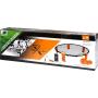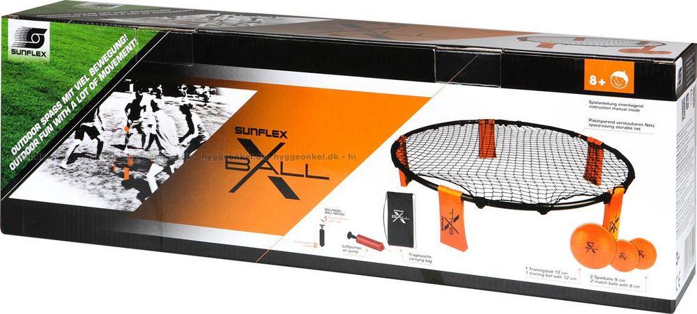 1 nät (mäter ca. 90 x 90 x 20 cm - ska monteras innan användning), 1 stor boll (i plast - diameter 12 cm), 2 små bollar (i plast - diameter 9 cm) och förvaringsväska.