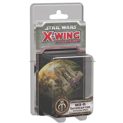 The M3-A Interceptor Expansion Pack — part of the sixth wave of starship expansions for the Star Wars: X-Wing Miniatures Game — includes one pre-painted M3-A interceptor miniature, four ship cards, and five upgrades, allowing you to fly this ship as a nimble low-budget Scum faction fighter or as a "Heavy Scyk", capable of equipping a cannon, torpedoes, and missiles.