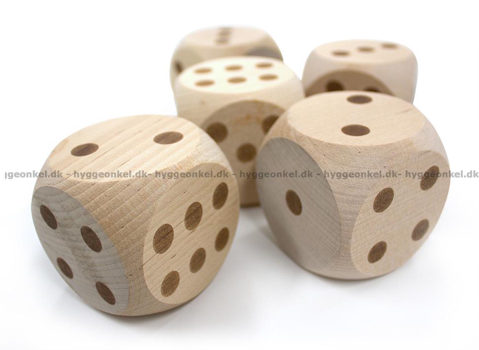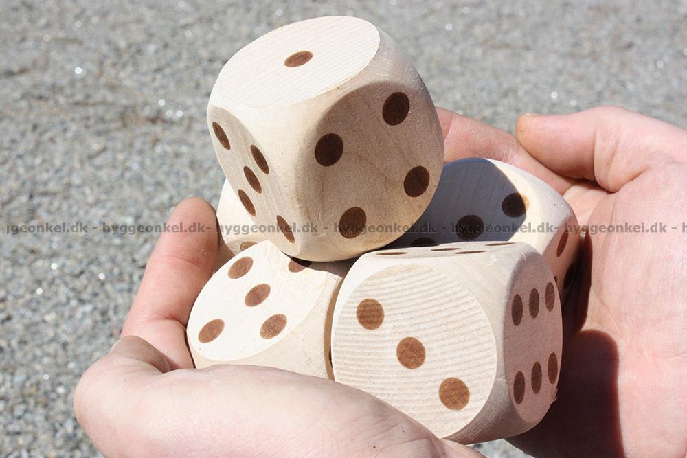 Här får du 5 stora tärningar (sidorna är 5 cm), så du kan spela Yatzy på altanen, på gräsmattan, på uppfarten - ja överallt!