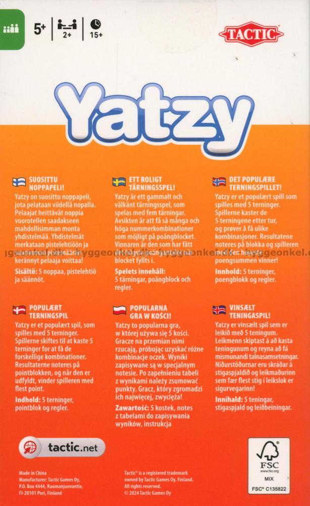 Klassisk Yatzy med 5 tärningar. I asken finner du 5 tärningar, regler och poängblock.