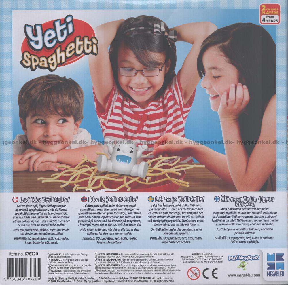 Spelarnas uppgift är att flytta på spaghettitrådarna utan att yetin ramlar i skålen. Den som drar den spaghetti som gör att yetin trillar i förlorar och alla andra vinner. Enkelt och roligt!