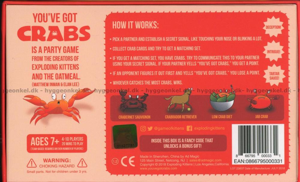 När du har fyra likadana Crab Cards får du inte säga något. I stället ska du använda ditt lags hemliga signal. När din lagkamrat upptäcker det ska han eller hon peka på dig och ropa "YOU'VE GOT CRABS!"