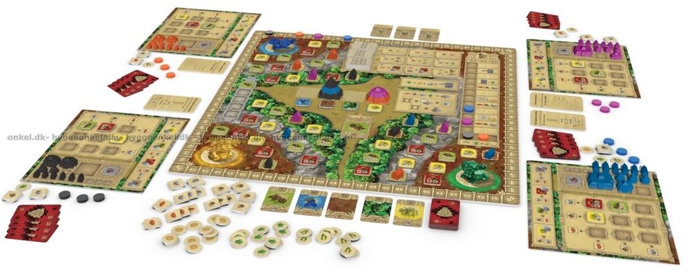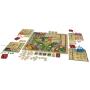 Spelbräde, individuella spelplattor, kort, pjäser i plast, pjäser i trä och marker i kartong.