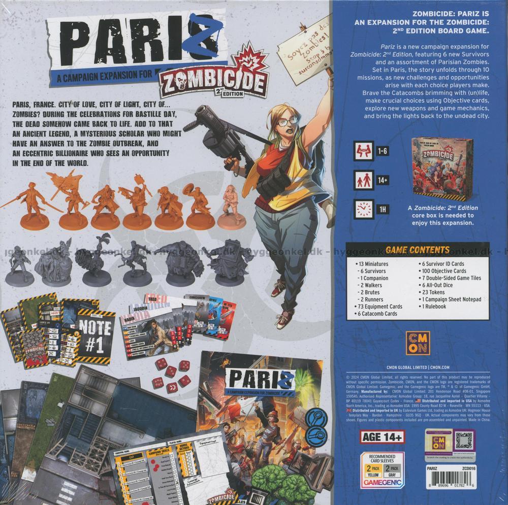 Zombicide 2nd Edition: PariZ tar dig till Paris under Bastiljdagen, där de döda plötsligt reser sig och kastar staden in i kaos. Mitt i paniken möts sex överlevande av en mystisk person som kanske känner hemligheten bakom zombieutbrottet – men också en excentrisk miljardär som ser världens undergång som sin stora chans.