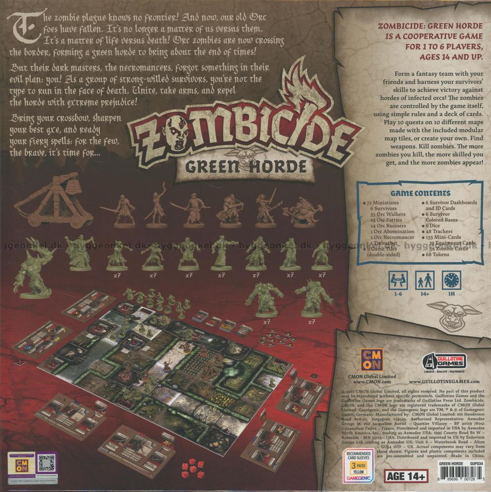 Zombicide: Green Horde är en fristående uppföljare i serien Zombicide Black Plague. I spelet ska spelarna samarbeta och ta på sig roller som överlevare efter zombie-apokalypsen. I varje scenario i spelet har de olika mål att uppfylla och de måste använda nya strategier för att kunna besegra detta kraftfulla, nya, gröna hot. Orch-zombier är mer kraftfulla än människo-zombier och det finns alltid en risk att en hel hord av orch-zombier släpps lös på bordet. Det här är en utmaning som mänskligheten aldrig tidigare har mött. Vem kommer att överleva den nya apokalypsen?