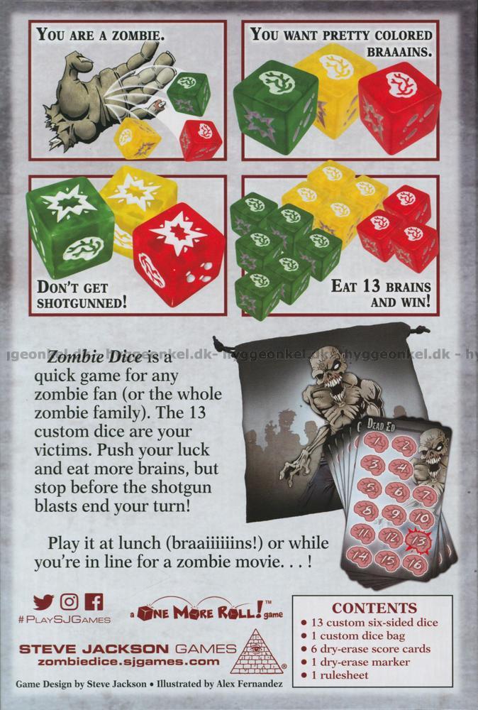 Detta är ett snabbt spel skräddarsytt för zombie-fans (eller hela familjen). De 13 tärningarna är dina offer men du ska se till att sluta äta innan du blir skjuten. Hur länge vågar du fortsätta?