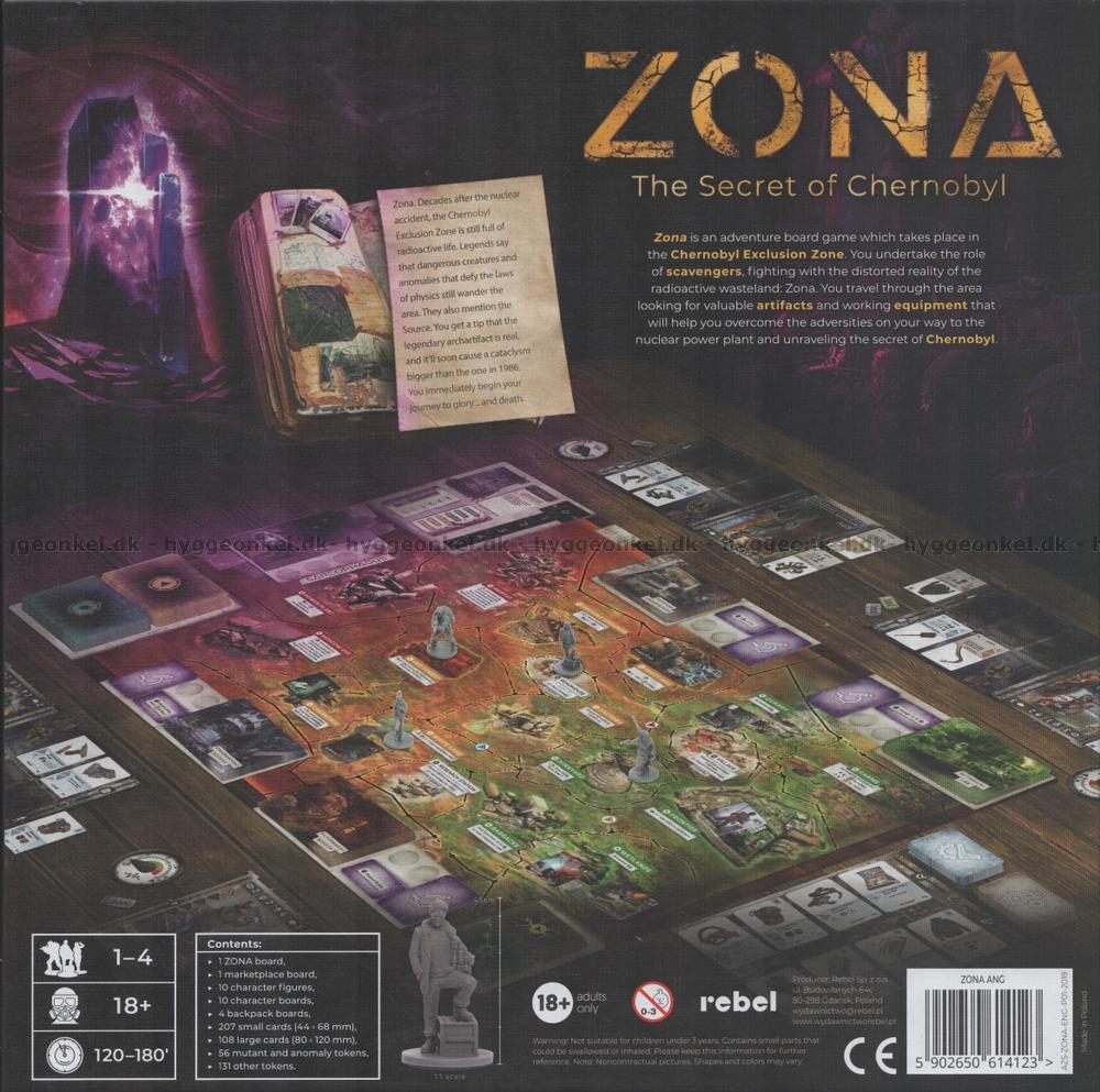 Zona är ett äventyrsbrädspel för 1-4 spelare. För att vinna gäller det att vara först med att nå fram till och öppna Tjernobyl-kraftverkets "sarkofag". För att öppna sarkofagen ska den spelaren ha funnit två hemligheter från underjordiska faciliteter. Spelarna ska skynda sig, för det finns en tidsbegränsning som hela tiden hotar.