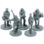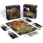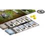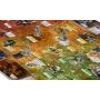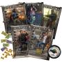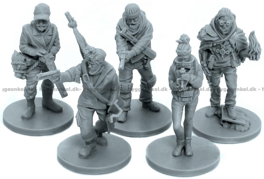 Spelbräde, miniatyrfigurer i plast, kort, tärningar och marker.