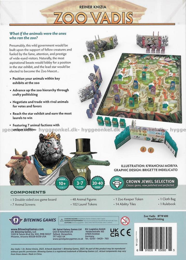 Det räcker inte att samla flest poäng – om dina djur inte når fram till Stjärnutställningen har du ingen chans alls. Endast den mest strategiska, övertygande och politiskt skickliga spelaren kommer att kunna kalla sig den sanna Zoo-maskoten. Frågan är därför inte bara om du vinner – utan hur du tar dig dit. Zoo Vadis frågar dig: Vart är du på väg?