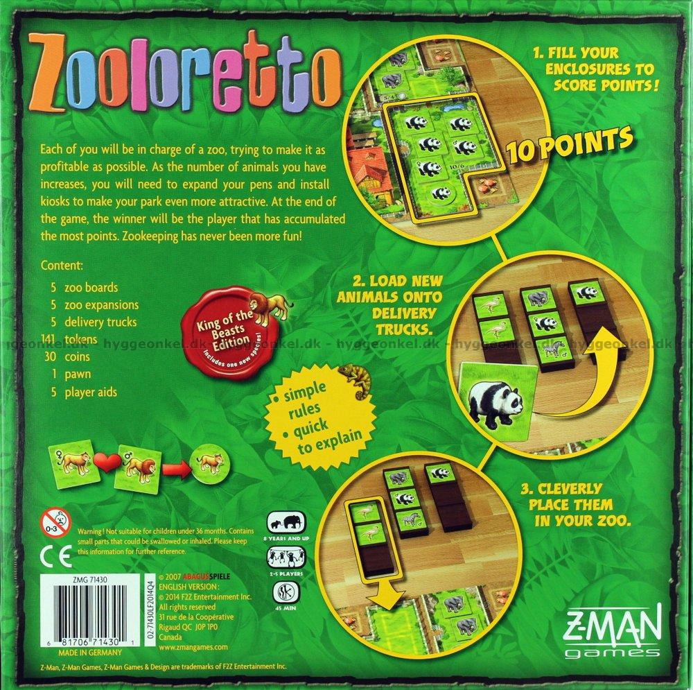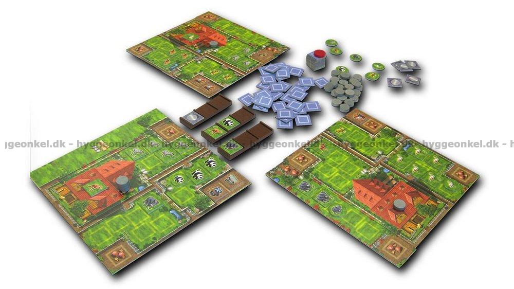 I kartongen för spelet hittar du: 5 zoo-bräden, 5 zoo-expansioner, 5 lastbilar, 30 mynt och givetvis också en mängd djurmarker.
