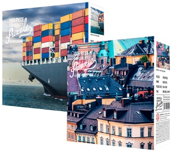 På pusselaskarna finns också en touch av humor - för hur lång tid tar det egentligen att lägga ett pussel från Kylskåpspoesi?